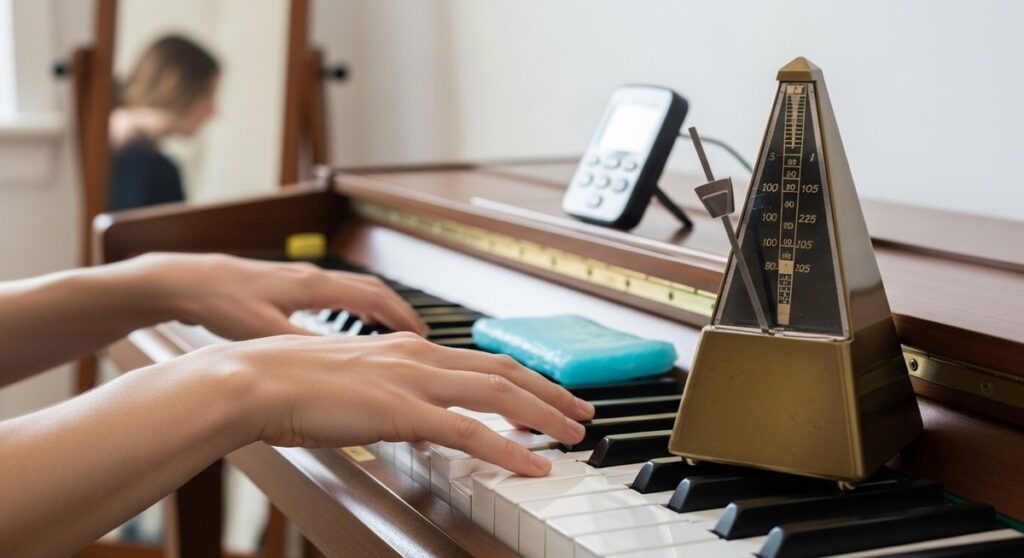 ピアノのオクターブ奏法で手が届かなかったり疲れやすかったりする悩みを解消しましょう。力任せではなく手首の回転や腕の重さを活用する正しい動かし方から、速いフレーズでも崩れない脱力のコツまでを詳しくまとめました。ヤマハのメトロノームなどの活用アイテムも紹介するので、安定感のある力強い演奏を身につけましょう。 -