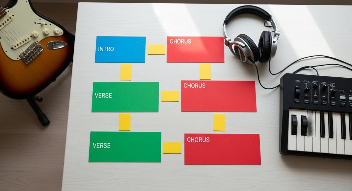 曲作りで迷子にならないためには、最初に「この曲はどんな順番で進むのか」という大枠を決めておくことが大切です。例えば、イントロから始まってAメロ、Bメロ、サビと進むJ-POPの王道パターンなどは、日本人の耳に最も馴染み深い流れの一つです。