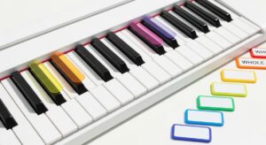移調の第一歩は、音の距離を正しく把握することです。ピアノの鍵盤を思い浮かべてみてください。隣り合う鍵盤(白鍵と黒鍵の両方を含む)の距離が「半音」、半音2つ分が「全音」です。